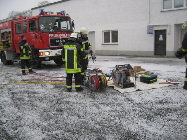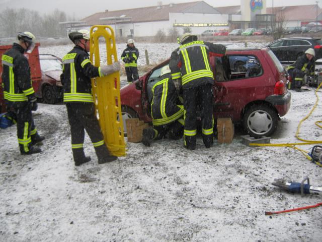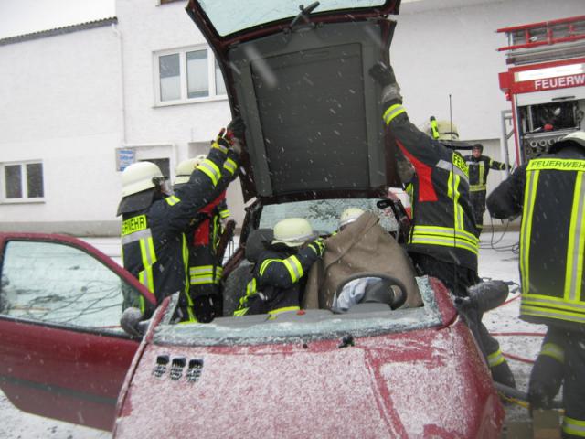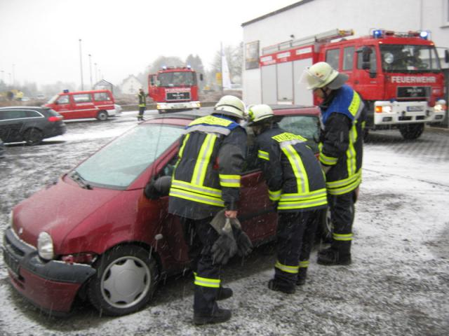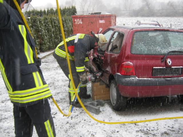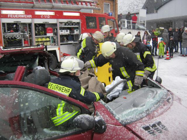 Die Arbeit der Freiwilligen Feuerwehr näher bringen, Einblicke in Taktik und Technik gewähren oder einfach nur zu schauen und Fragen stellen - das war der Programmpunkt der Firma Hoppe beim diesjährigen "Opel Adam angrillen". Dazu wurde ein Unfall auf dem Betriebsgelände angenommen, Ein PKW prallte vor einen Schrottcontainer, der Fahrer wurde im Fahrzeug eingeklemmt, war jedoch bei Eintreffen Feuerwehr soweit ansprechbar und stabil. Löschzugführer Helmut Deworetzki ließ es sich nicht nehmen, sich persönlich vom LZ Personal Retten zu lassen. Kommentiert wurde die gesamte Übung über Lautsprecher durch den stellv. Löschzugführer Ralf Scholle. Trotz starkem Schneefall verfolgten interessierte Besucher die Vorführung. Die verunfallte Person wurde patientengerecht mittels Spineboard aus dem Fahrzeug befreit. Dazu wurde eine Erstöffnung geschaffen um Kontakt aufzunehmen, der Patient wurde während der gesamten Befreiung im Fahrzeug betreut und vorab Erstversorgt. Bereitstellung der Geräte auf TH Plane, Sicherstellung Brandschutz, sichern des Fahrzeugs gegen wegrollen und vor allem gegen Erschütterungen während der Rettung. Glasmanagement, Einsatz von hydraulischem Rettungsgeräte (Rettungsschere, Spreizer und Hydraulikstempel). Nach erfolgter Rettung der Person stand die Feuerwehr für Fragen zur Verfügung.