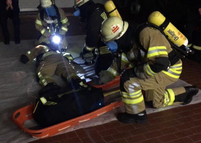 Die dritte Lage:Atemschutznotfall verunfallter Angrifftruppmann Verletzungsmuster Fußverletzung und einem defekt an dem Atemschutzgerät wurde nach 3 stufigen Treppensturz simuliert.Der Sicherungstrupp musste vom Gruppenführer wie bei den vorrigen Lagen aus der Bereitstellung in den Einsatz gebracht werden.(Aufgabe Sicherheitstrupp Lage vor Ort erkunden und beurteilen welche Maßnahmen zur Abwendung der Gefahren die auf den verunfallten Angriffstruppmann wirken mit ihren Mitteln abzuwenden sind.
