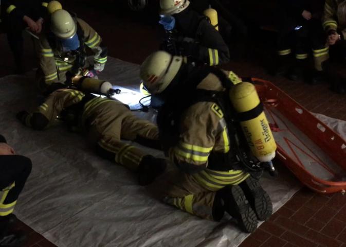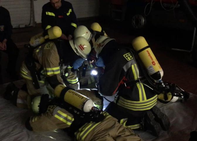 Versorgung des in Not geratenen Atemschutzgeräteträger. (Foto: Feuerwehr Warburg)