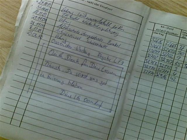 Der letzte Eintrag im Fahrtenbuch nach der Überführungsfahrt zum Feuerwehrhaus Warburg. (Foto: Jürgen Rabbe)